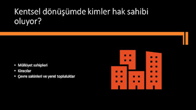 Şimdi buradan mülkiyet sahipleri, kiracıları ve çevre sakinleri, yerel topluluklar dediğimiz zaman aslında bu, tabii ki kiracıların da şikayet etme hakları var. Yani kentsel dönüşüm, burada olay daha çok malikler üzerine. Orada şikayet edebilir çevreci gelir, ama tabii böyle bir durumda, yani kiracının yapacağı çok fazla bir şey yok. Zaten çıkmak durumunda, onun bir kira gelir elde etme öyle bir durumu da söz konusu değil. Bu tamamen mülk sahipleri üzerinde devam eden bir süreç.