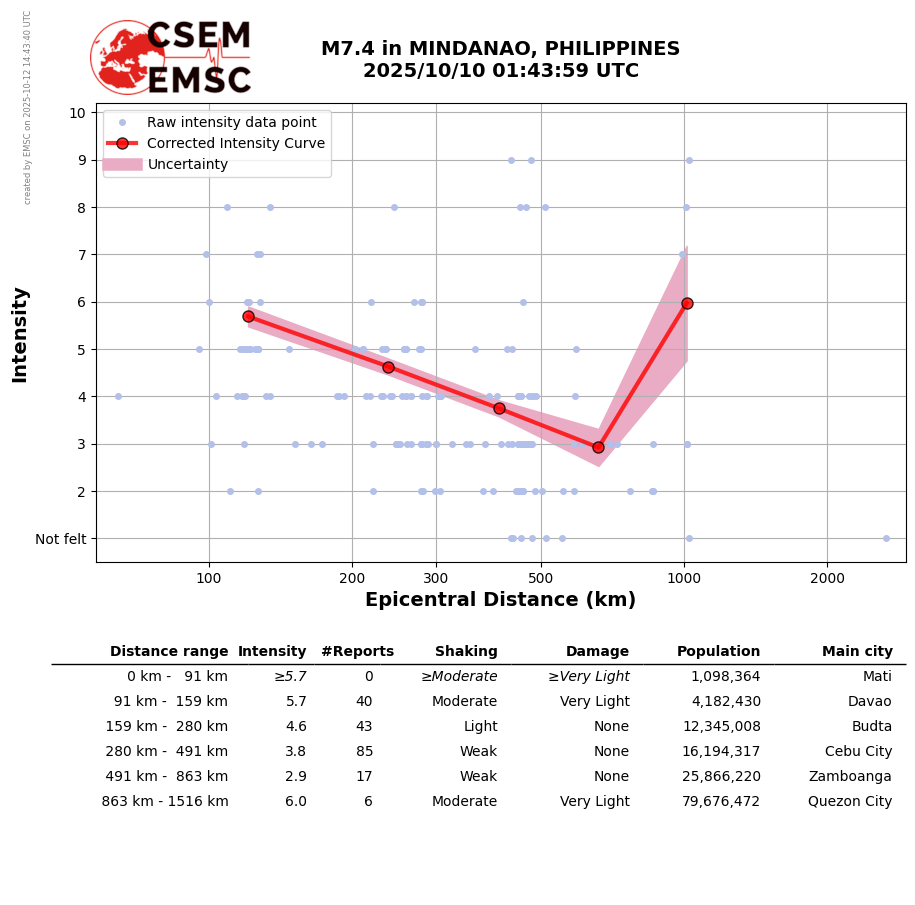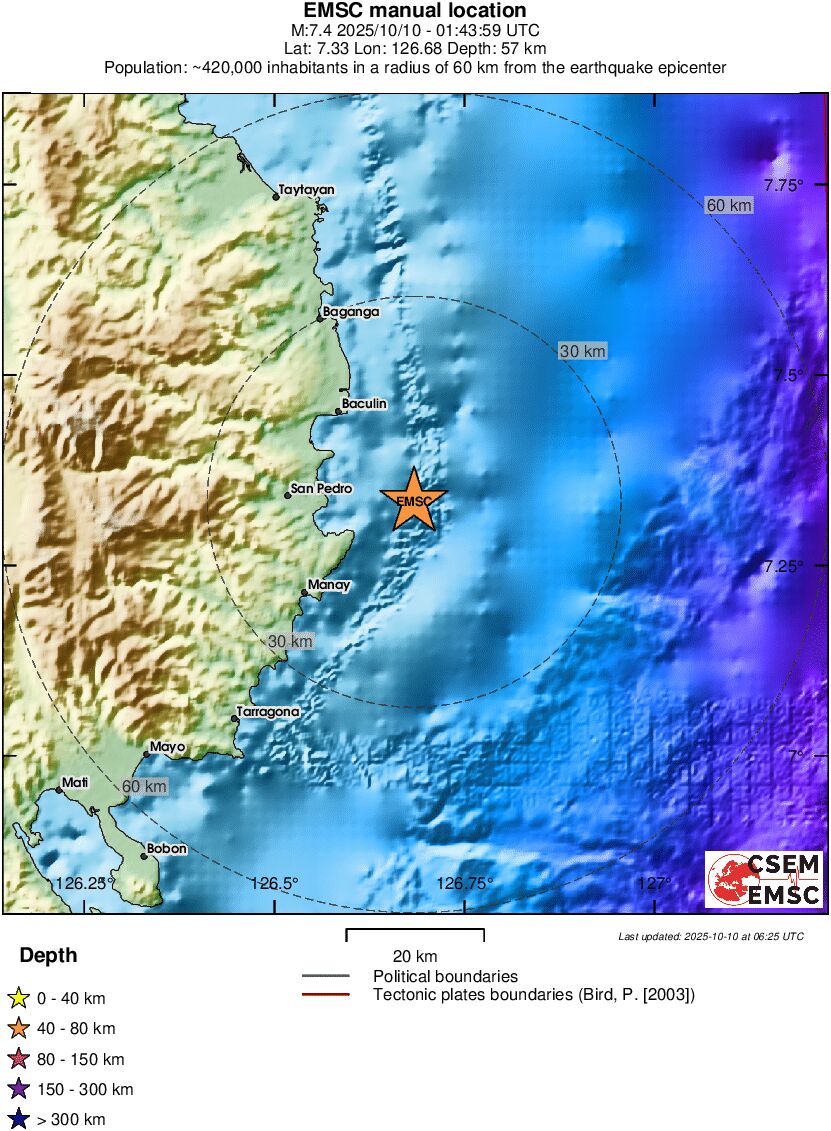 10 Ekim 2025'te, saat 01:43:59 UTC'de (yerel saat: 09:43:59), Filipinler'in Santiago'nun 20 km doğusunda (7.265°K, 126.755°D), 58.1 km derinlikte M7.4 deprem meydana geldi. Orta derinlikte (40–70 km) bir olay olarak sınıflandırılan deprem, Pasifik Ateş Çemberi'nde gerçekleşti. Moment tensör çözümleri Mw 7.4'ü doğruluyor. Detaylar için EMSC Deprem Sayfası veya USGS Yürütme Özeti'ne bakın.
